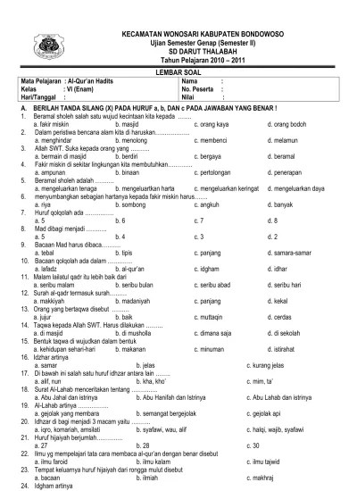 Lengkap kumpulan soal ukk qur an hadits sd mi semester 2 genap blog .